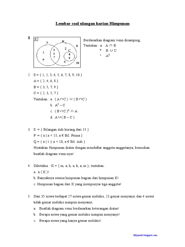 Tag Soal Essay Himpunan Kelas 7 Beserta Jawaban Kumpulan Contoh Surat Dan Soal Terlengkap from contoh123.com Soal matematika kelas 7 di lengkapi dengan berbagai soal pilihan pg atau essay kurikulum untuk smp dan mts lengkap dengan kunci jawabannya. Sebutkan berbagai macam peralatan tik yang kamu ketahui! Jelaskan apa yang dimaksud dengan interaksi sosial. Soal matematika himpunan 1.apabila a = { x | 1 x < 13 , x p} maka dengan menyebutkan anggotanya a adalah. Soal prakarya untuk kelas vii. Soal dan pembahasan juga bisa kalian download untuk tugas sekolah yang mana file bisa diedit dan silahkan digunakan. Himpunandi desa sabulan yang terletak di pulau samosir terdapat 100 rumah tangga. Untuk contoh soal himpunan diagram venn sd smp sma kelas 9c terdiri dari 31 orang siswa.